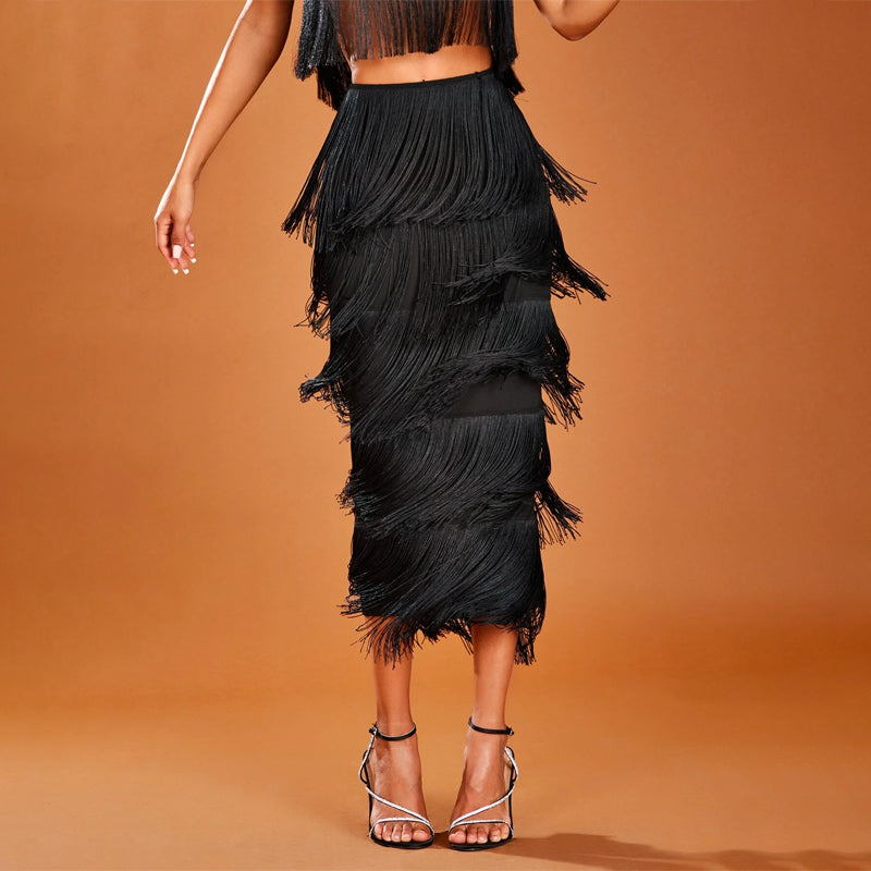 High Waist Fringe Trim Skirt